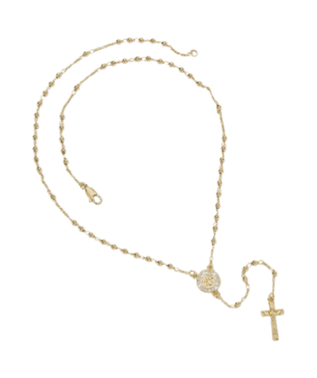 This meaningful rosary necklace features the Saint Benedict medal and a polished 14K gold finish. A piece that blends faith, tradition, and refined craftsmanship.